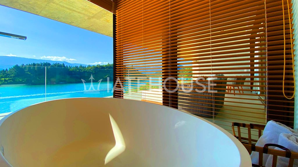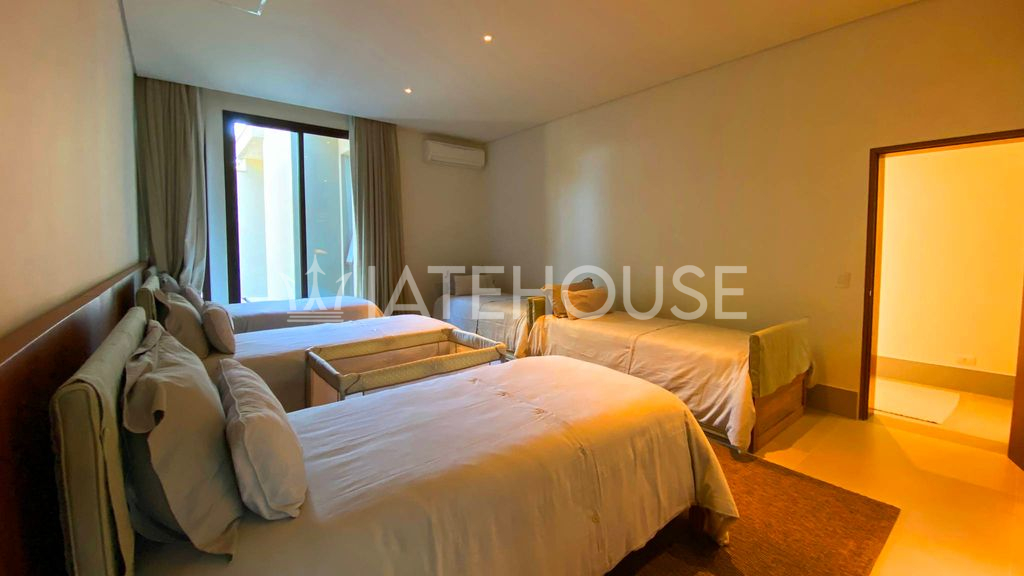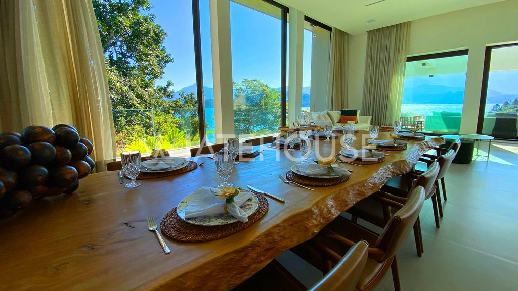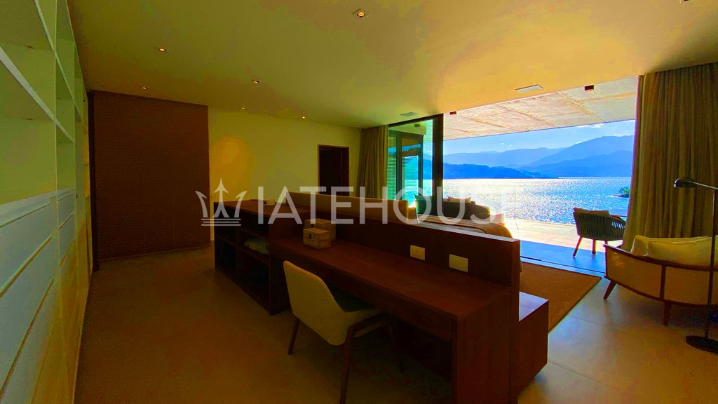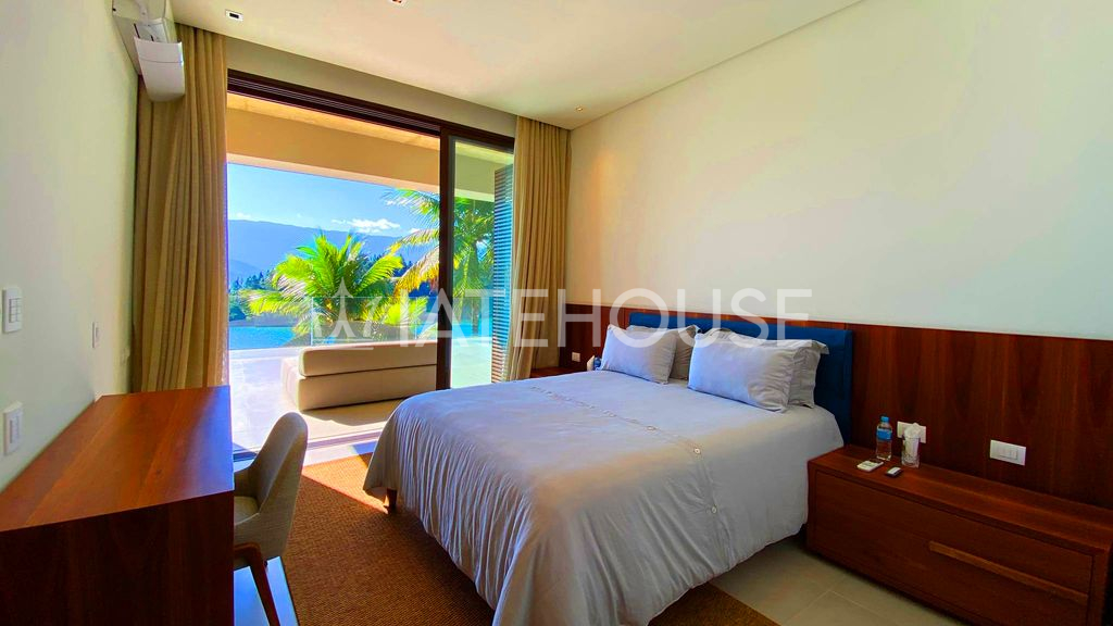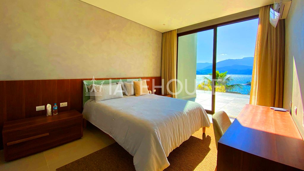 Na área íntima, a casa principal oferece 5 suítes, incluindo uma máster incomparável, com varanda privativa e banheira posicionada de frente para o mar — um convite diário para contemplar o nascer e o pôr do sol sobre as ilhas.